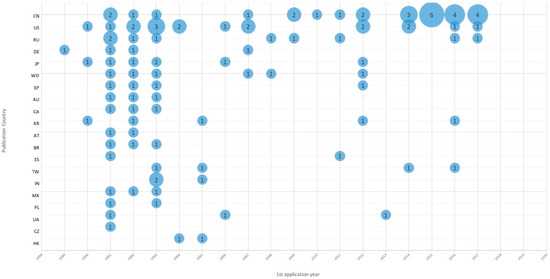 Publication country by year. This graph represents the location of patent publications and their changes over time. Abbreviations: CN-China, US-United States, RU-Russia, DE-Germany, JP-Japan, WO-World Intellectual Property Organization, EP-European, AU-Australia, CA-Canada, KR-Korea, Republic of, AT-Austria, BR-Brazil, ES-Spain, TW-Taiwan, IN-India, MX-Mexico, PL-Poland, UA-Ukraine, CZ-Czech Republic, HK-Hong Kong. The size of the blue circles represents the number of the patent documents.