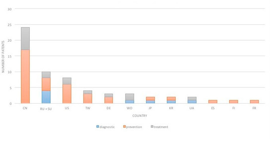 Number and type of patents per country. This graph represents the number and type (diagnostic, prevention or treatment) of patents per country. Abbreviations: CN-China, RU-Russia, SU- Union of Soviet Socialist Republic, US-United States, TW-Taiwan, DE-Germany, WO-World Intellectual Property Organization, JP-Japan, KR-Korea, Republic of, UA-Ukraine, ES- Spain, FI-Finland, FR-France.