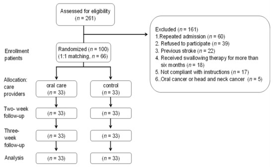 - Takahata, H.; Tsutsumi, K.; Baba, H.; Nagata, I.; Yonekura, M. Early intervention to promote oral feeding in patients with intracerebral hemorrhage: A retrospective cohort study. BMC Neurol. 2011, 11, 6. [Google Scholar] [CrossRef]