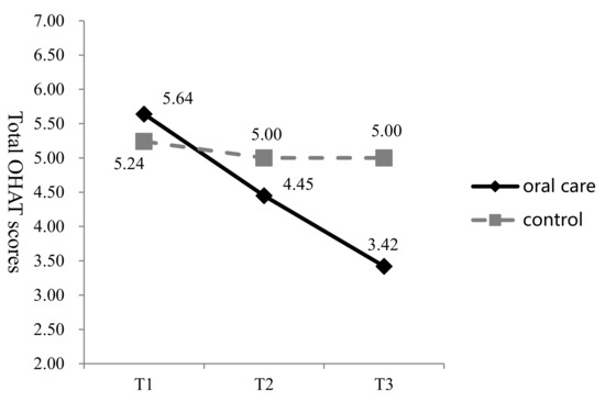 Change in the Oral Health Assessment Tool (OHAT) scores in the two groups at three time points (T1–T3).