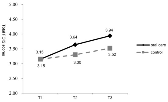 Change in the mean Functional Oral Intake Scale (FOIS) score in the two groups at three time points (T1–T3).