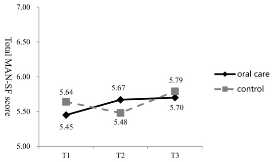 The mean MNA-SF score in the oral care group was 5.45 (SD = 2.48), 5.67 (SD = 2.59), and 5.70 (SD = 2.60) at T1, T2, and T3, respectively. In the control group, the respective scores were 5.64 (SD = 2.03), 5.48 (SD = 2.17), and 5.79 (SD = 2.37) (Figure 4). In the oral care group, the mean MNA-SF at T3 was 0.25 points higher than that at T1, compared to a respective increase of 0.15 in the control group. The GEE analysis showed a statistically non-significant improvement in the MNA-SF in the oral care group at T3 (interaction effect, 95% CI = −0.35 to 0.53, Wald χ2 = 0.17, p > 0.05) (Table 3). GEE analysis indicated that the observed longitudinal difference in scores between the two groups was not statistically significant.