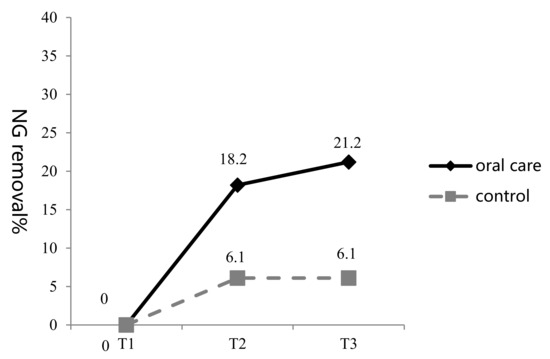 In this study, we found that nine subjects (two in the control group vs. seven in the oral care group) had their nasogastric tubes removed at T3. An increased rate of nasogastric-tube removal was noted in the oral care group (21.2% vs. 6.1%, respectively). However, this difference was statistically nonsignificant. This result is similar to findings by [15], who reported that oral health care can improve the outcomes associated with oral food intake function.