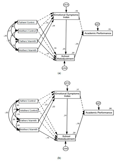 Regarding gender differences, the results indicate that the model fits male and female groups, and that the same structure, albeit with different parameters, can be accepted, regardless of the teenagers’ gender. One of the main differences is observed in the control dimension. In the case of males, an effect of the control exercised by the father was observed, namely a negative effect on school adjustment, which was not observed in females. The negative effect of control supports the hypothesis that, within the cultural context of parental control, it does not play a protective role against their sons’ problems of school adjustment. The fact that these same results are not found in daughters could be due to the fact that in both groups, the educational practices of the same-sex parent seem to be more important, although the differences were not statistically significant. In addition, emotional symptomatology had a higher association with school maladjustment in the case of females. A tentative explanation for this fact might be the greater prevalence of emotional symptomatology in girls, which has been observed in many studies. In fact, a vast number of studies have reported higher levels of anxiety and depression among girls when compared to boys [67,68,69,70,71]; specifically, higher mean scores on the internalizing factor of the BASC-S3 have also been found [59].