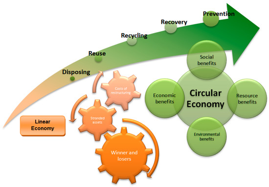 Waste management is currently carried out in the following order: production, presentation, collection, transport, and treatment. According to Argudo-García et al. [8], all waste should be reused, and for that, circular economy aims to minimize the elimination. Figure 1 shows the transition from a linear to a circular economy model.