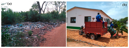 According to Yukalang et al. [11], solutions to this problem could include developing appropriate policies and implementation plans, initiating a collection service that supports waste separation at the source, and educating the citizens of the campus and the government of the university. As Douti et al. [17] show, waste management institutions in developing countries face financial difficulties, understaffing, poor logistics (Figure 2b), road conditions, and social constraints.