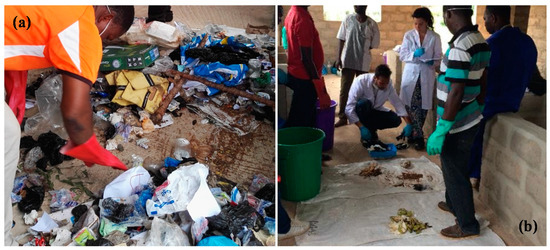 Laboratory work for urban solid waste characterization at the University of Lome. (a) Quartering and (b) weighing of some fractions after the separation.