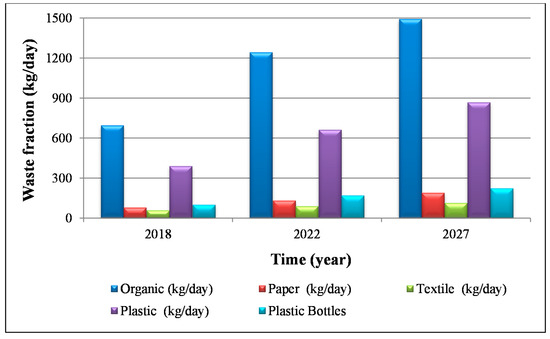 These two time horizons are justified, since it is not possible to predict waste evolution within a horizon longer than 10 years in a developing country, because the pace of evolution is unknown. The estimations of total waste for these horizons are 2427.2 kg/day in 2022 and 3034.7 kg/day in 2027.