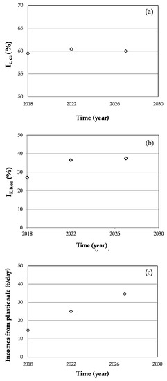 Figure 6c shows income variability from 2018 to 2027 due to the increase in the total amount of plastic generated.