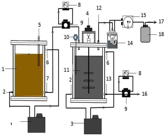 The experimental CSTR setup is shown in Figure 1. In this study, the total volume of the anaerobic reactor was 8 L, including an effective working volume of 6 L. The temperature was adjusted by a water jacket surrounding the reactor so that the digestion chamber could be kept at a constant mesophilic temperature of 35 ± 0.5 °C. Two duplicate reactors were used in this experiment to minimize the chance error. All the reactors were sealed by caps with a stirrer in the middle and an outlet that connected to a biogas bag. All the biogas generated by the CSTR was quantified through a wet gas flowmeter before proceeding to these bags. Besides this, the temperature of the substrate tank was set at 4 °C to prevent the biological decomposition of the raw material before its use, as the experiment lasted nearly half a year. To keep the raw material and inoculum well distributed, the mechanical stirring device of the reactor continued stirring at a rotating speed of 60 rpm during the whole process of the experiment.