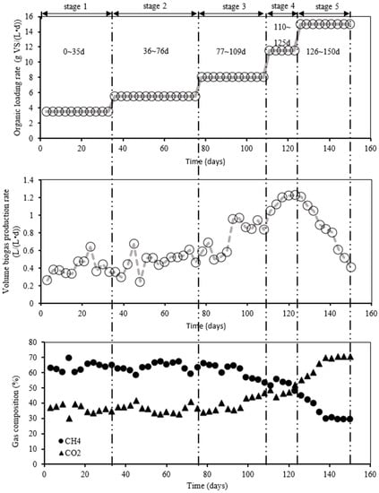 The experiment was conducted for 150 days in total and was divided into five stages (Stages 1–5) according to the different OLRs. The fluctuations in the volumetric biogas production rate (VBPR) and the biogas composition (i.e., methane and CO2 contents) along with the AD reactor operation time are shown in Figure 2. Overall, in the first four stages, the VBPR gradually increased with the increase of the influent OLR; although in the fourth stage the methane content was slightly lower than in the first three stages, the total yield of methane still increased. Therefore, these four stages could be regarded as a stable period from the methane yield perspective. Then, both the VBPR and methane content decreased suddenly during the fifth stage. The methane content remained stable (around 65%) during the first three stages and was maintained at around 55% in the fourth stage but sharply dropped to 25% during the last stage. Consequently, the fourth stage was a transition stage, because the methane content in this stage diminished but still maintained relatively stable; since the VBPR was still increasing, the total volume of methane even improved slightly.