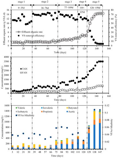 It can be seen in Figure 3 that inhibition was not found from Stage 1 to Stage 4, when the TAN and FAN concentrations were under 1600 mg/L and 500 mg/L, respectively, indicating that the AD system was not inhibited when the organic loading OLRs were no more than 11.5 g VS/(L·d). Additionally, the ever-increasing TAN in the fourth stage should be noted as it shows that inhibition had already accumulated at that time. However, when the OLR reached 15 g VS/(L·d), the TAN and FAN concentrations reached 2560 mg/L and 558 mg/L, respectively, which eventually caused the failure of the AD.