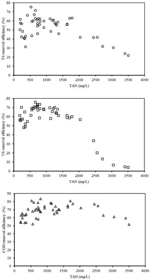 Afterwards, the organic removal efficiency (especially based on TS and VS) dropped as the TAN concentration continued to rise. Besides this, applying the indicator of COD removal efficiency can more precisely represent the overall removal efficiency of the AD system than TS. COD tended to increase when the anaerobic organisms were under the period of acclimation, while the TS remained almost unchanged. This finding supported the previous result that AD would be inhibited beyond a certain level of TAN concentration [].