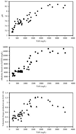 Effect of TAN on the pH, alkalinity, and volumetric biogas production rate. (TAN is not an independent variable here; it may also correspond to one or more dependent values.).