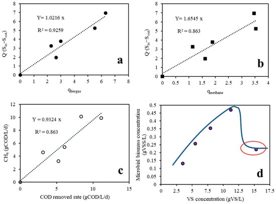 (a) Variation in Q·(Sin − Sout) as a function of daily biogas production; (b) Variation in Q·(Sin − Sout) as a function of daily methane production; (c) VMPR as a function of the volumetric COD removal efficiency; (d) Variation in the calculated microbial biomass concentration as a function of the VS concentration.