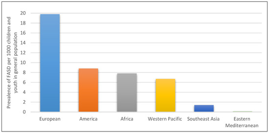 One in 13 alcohol-exposed pregnancies results in diagnosable FASD and the global prevalence of FASD is estimated at eight per 1000 children and youth [6]. A systematic review using 2012 data estimated the prevalence of FASD around the world among children and youth in general population using World Health Organization (WHO) regions [6] as shown in the chart below (Figure 1).