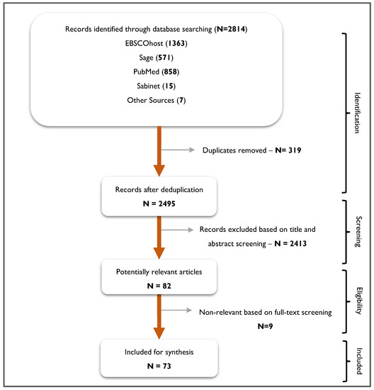 The database search yielded 2814 articles and 2495 were included after removal of the duplicates. Eight-two articles were potentially relevant articles after the title and abstract screening and 73 after the retrieval of the full text. Seventy-three articles met the inclusion criteria for the final synthesis. B.O.A. and F.C.M. independently searched and screened the included articles and all the disagreements were resolved by C.E. (see Figure 2).