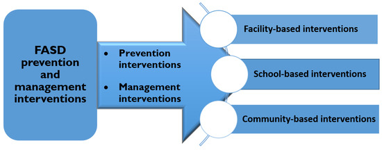 Seventy-three studies, of which 32 were prevention interventions studies and 41 management interventions, were included in this review. We found the interventions (prevention and management) effective or to show promising outcomes in either preventing or managing FASD. Although, four of the interventions that met the inclusion criteria and were classified as facility-based interventions (two prevention and two management) were not effective because they require further research to determine their effectiveness.