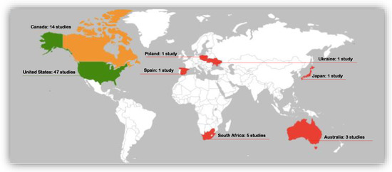 We mapped the distribution of the prevention and management interventions based on settings within which each of the identified studies were conducted (Figure 4). Most of the studies were conducted in the United States (47 of the 73 studies). Canada recorded the second highest studies on FASD prevention and management studies (14 studies). Five studies where identified to be conducted in South Africa and three from Australia. Ukraine, Poland, Spain, and Japan had one study each. Our analysis showed no other published articles in any other countries.