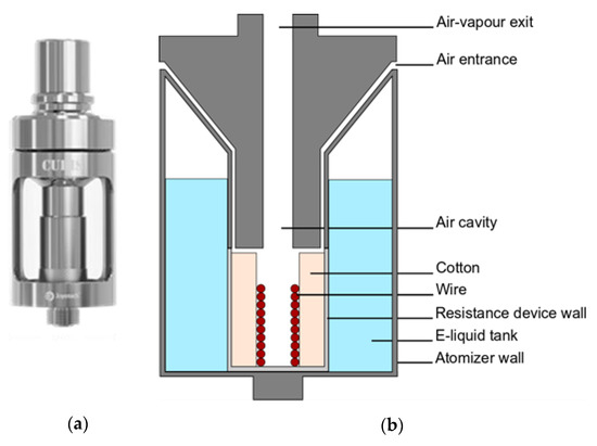 The commercial clearomiser used in this study was a Cubis one (Figure 1a) supplied by JoytechTM. It is made of a coil and a wick (organic cotton). The coil is composed of a rolled wire. This wire is composed of three parts: Both extremities are non-resistive (to avoid the burning of the closest elements with which they are in contact with) and the central part, connected to both non-resistive extremities, is resistive to ensure optimal heating of the soaked wick. The wick is rolled around this coil. From the vertical axis to the outer surface of the device, there is first, the air cavity where the inhaled air is mixed with the generated vapor. Then, the heating wire is rolled with a diameter of 2 or 3 mm. The wick is inserted between the central part of the wire and the resistance wall. The e-liquid tank takes place between the resistance wall and the clearomiser wall (Figure 1b).