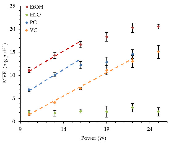 A preliminary series of experiments was performed to determine the optimal power that should be used as a reference power for all the experiments. The aim was to test each pure liquid and to characterize the influence of the power, ranging from 10 to 25 W by intervals of 3 W, on the MVE. Thus, we were able to determine whether the optimal regime is the same for different liquids. Figure 2 presents the influence of the reached supplied power on the MVE for the four studied pure liquids. The optimal EtOH, PG, and VG regimes are also illustrated.
