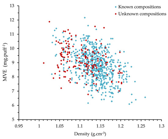 MVE (mass of vaporized e-liquid) of 800 commercial liquids measured after standardized emission generation versus their densities.