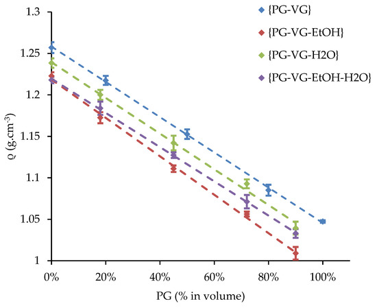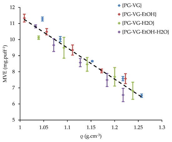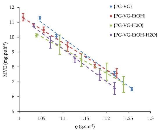 MVE—Influence of the density using {PG-VG}, {PG-VG-EtOH (10%)}, {PG-VG-H2O (10%)}, and {PG-VG-EtOH-H2O (5%–5%)} ranges.