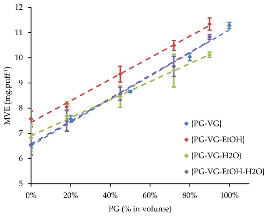Influence of the PG volume fraction of {PG-VG}, {PG-VG-EtOH}, {PG-VG-H2O}, and {PG-VG-EtOH-H2O} mixtures on their MVE (measured at ambient temperature, with a supplied power of 15 W).