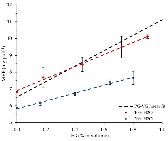 Furthermore, 10% of the H2O range was added to the {PG-VG} mixtures, and the obtained fit was linear as for the {PG-VG} mixtures (see Figure 6). The slope and the intercept for the 10% volume fraction are reported in Table 6. We can observe an important gap between the slopes obtained for {PG-VG} without and with the range of H2O that changed from −20.24 to −15.78 × 10−3 cm3·puff−1. The {PG-VG-H2O} dots had less repeatability than the {PG-VG} and {PG-VG-EtOH} ones. For the same PG-VG ratio, the {PG-VG-H2O (10%)} dots were lower than the {PG-VG} ones mostly at high PG volume fractions (see Figure 5). In contrast to EtOH, the heat capacity and enthalpy of vaporization of H2O were close to twice the PG and VG ones (see Table 4). Although, the H2O boiling point was close to half of the PG and a third of the VG ones, the required energy to increase in temperature and then to vaporize a liquid that contains H2O will be higher than without.