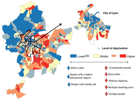 Lyon MA is mostly an urban metropolitan area so instead of using an urban–rural indicator, we selected the following variables more appropriate to the study setting: the personal and professional mobility of each census block (different way to do home to work transport, stability or frequent relocation of home), housing description, and car and home owners. Data are available and come from the INSEE national census of 2014.
