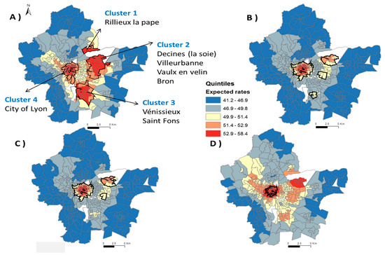 We demonstrated that except for the city center of Lyon, the socioeconomic deprivation explained a large portion of variation in the low participation of mammography screening, confirming previous research that reported a lower participation rate in the highly deprived area [18]. Similar results have been found in France using other deprivation indices [19,20,34,35], or using individual socioeconomic factors [36,37]. The majority of the highly deprived census blocks are located in the close suburban area where two clusters were identified.