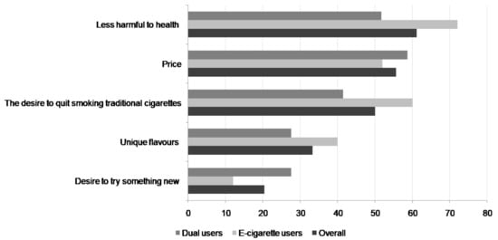 Almost all exclusive e-cigarette users (96%) had ever tried cigarette smoking. Out of the 60 e-cigarette users, 18.5% initiated nicotine use by e-cigarette. E-cigarette, as a first nicotine product, was declared by 16% of exclusive e-cigarette users and 20.7% of dual users (p = 0.6). The most common reasons stated for starting to use e-cigarettes were it being less harmful to health, price, and desire to quit traditional smoking. The reasons stated for using e-cigarettes are presented in Figure 1.