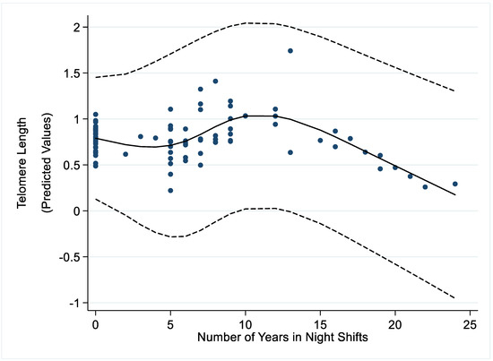Spline models did not show evidence of an association between NYNS in current and former night shift workers and the investigated epigenetic outcomes, with curves depicting the exposure-response function that were mostly flat (Figures S1–S8). On the other hand, the model inspecting the relationship between NYNS and telomere length did show a pattern of the data, with an increase in telomere length for values of NYNS up to about 12 years, and a subsequent decrease (Figure 1).