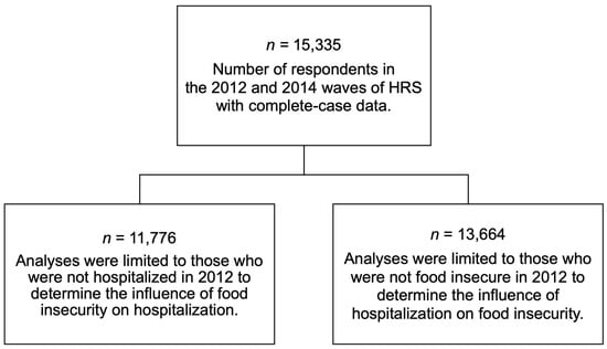 This study included those who participated in both the 2012 and 2014 HRS waves (n = 16,502). Analyses were limited to those without missing data for variables of interest (n = 15,335; 93% of eligible individuals). Given that poor health status may increase vulnerability to food insecurity [22], analyses testing whether food insecurity was associated with future hospitalization included respondents who did not report hospitalization in 2012 (n = 11,776) to limit confounding due to baseline health care utilization. Analyses testing whether hospitalization was associated with future food insecurity included respondents who did not report food insecurity in 2012 (n = 13,664). Figure 1 provides a flow chart for this study’s analytical samples.