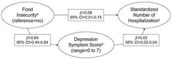 Findings of this study also indicated that the concurrent relationship of food insecurity and hospitalization was mediated by depression symptomology. Stigma and poor diet quality, associated with food insecurity, can contribute to depression [31,32]. Depression may reduce self-care and management of medical comorbidities, thus resulting in more frequent hospitalization [33,34]. Alternatively, hospitalization may lead to the onset of depressive symptoms, which could reduce one’s capacity to manage financial and food resources. Further work is needed to disentangle the relationship of food insecurity with hospitalization, and the mediating role of depression.