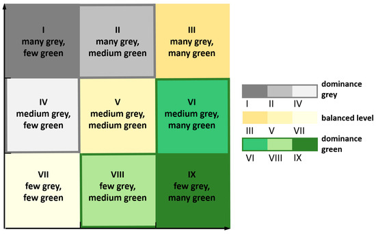 In the present contribution, a classification based on points awarded according to rank is used for characterising the areas studied with respect to the provision of the inhabitants with green space. In the approach, the indicators (i1)—(i6) described above are first calculated, and subsequently the areas studied are sorted in descending order according to the indicator values determined (Figure 1). In the next step, a number of points is derived using the reverse order. The number of points awarded for the first rank coincides with the total number of cities studied. All units of analysis receive a number of points for each indicator. The awarded points are summed separately for grey and green areas in cities. Subsequently, the summed values are entered into a 9-cell matrix with two coordinate axes (Figure 2) for a portfolio analysis. Depending on the cell assignment, the corresponding unit of analysis exhibits a dominance of grey or of green areas or a balanced level.