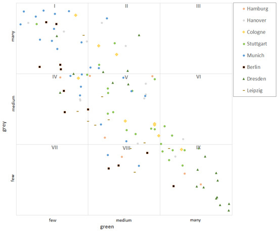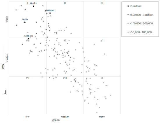When the classification was carried out, it revealed that except for Cologne all cities in Germany with at least one million inhabitants exhibit much grey and little green characteristics (Figure 3). In big cities with many inhabitants, the grey characteristics also often predominate. Cities in North Rhine-Westphalia form an exception in this respect with a balanced level. The larger towns are represented in all occupied cells. However, they often exhibit a dominance of green characteristics. The class IX (little grey, much green) is almost exclusively occupied by larger towns (e.g., Passau, Bergisch Gladbach).