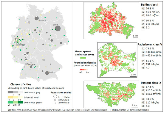 A categorisation of the cities at the federal level, underpinned by three examples of typical representatives of types I (Berlin), V (Paderborn) and IX (Passau), illustrates the results in maps (Figure 4). It can be seen very clearly that cities with a high number of inhabitants and smaller compact cities are usually dominated by grey infrastructure and a strong human impact on urban nature. The city examples provide an insight, both visually and via city-wide parameters, into the situation of city types with the most representatives (60% of the 187 cities belong to the fields I, V and IX). The opposing trends of ‘grey” and ‘green’ characterisation with increasing or decreasing city size and number of inhabitants can be understood with a view to the listed parameters, population density and green space relevant for recreational, of the 3 representatives shown (Figure 4).