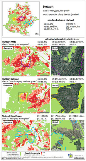Figure 6 shows the unequal distribution of urban green space within the example of the city of Stuttgart. The overview map at the top (entire city level) demonstrates that certain areas (dark red colour) are undersupplied with public urban green spaces (high population density and soil sealing); the other parts are ‘green’. This unequal distribution of urban green space within urban areas was found for a high number of major German cities (see also [60]).