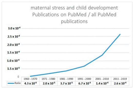 The relative portion of articles deposited on PubMed on maternal stress and child development.