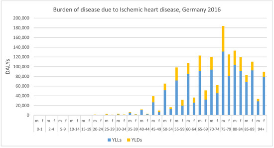Burden of disease due to ischemic heart disease in Germany 2016, expressed in total YLLs, YLDs and DALYs for males (m) and females (f) by age groups, YLLs = years of life lost due to premature mortality, YLDs = years lived with disability, DALYs = disability-adjusted life years.