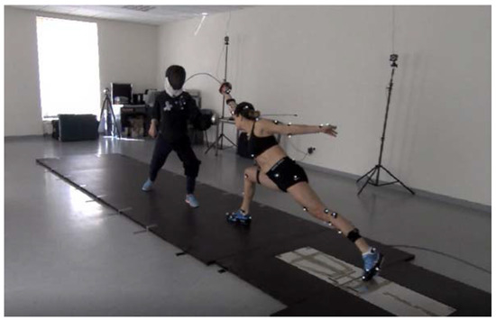 After a warm-up, the subjects performed six attempts of a straight touch towards the trainer’s trunk. The fencers repeated the flèche (Figure 1) and the lunge patterns thrice each (Figure 2). The practice was performed with the involvement of the coach. The coach’s outfit had OptiTrack markers placed on the target field. In addition, individual technical patterns were executed at the pace given by the coach, as this procedure is standard for a typical fencing practice with the participation of the coach.