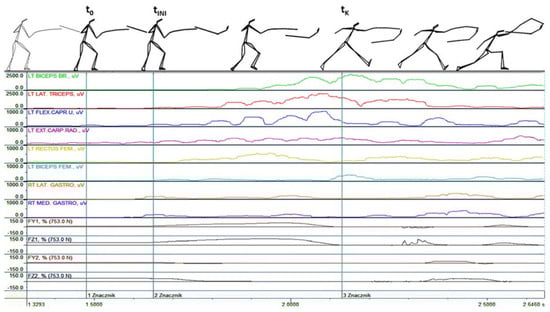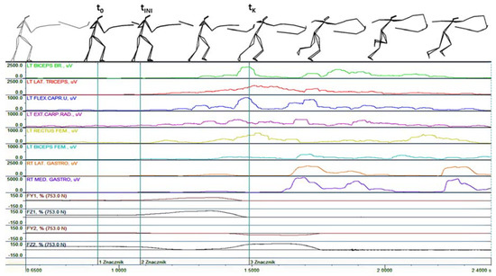 Measurements of the bioelectric signal employed a 16-channel EMG system manufactured by Noraxon (DTS, Desktop Direct Transmission System, Noraxon, Scottsdale, ZA, USA) with a sampling accuracy of 16 bits at a frequency of 1500 Hz. The analysis involved the following muscles: Biceps brachii (BB), triceps brachii (LT), flexor carpi ulnaris (FCU), extensor carpi radialis (ECR) on the upper limb holding the weapon, biceps femoris (BF), rectus femoris (RF) on the forward leg, and gastrocnemius as well as caput laterale and caput mediale (GL, GM) on the rear leg [3,11]. The muscle activation assessment applied Ag/AgCl electrodes attached to the subjects’ bodies in accordance with the SENIAM (surface EMG for non-invasive assessment of muscles) procedures. The assessment of the ground reaction forces employed two combined Kistler force plates (Kistler type 9286AA, Kistler, Winterthur, Switzerland) operating with the sampling frequency of 1500 Hz. The synchronization of the equipment was achieved by application of TTL (Transistor–transistor logic) signals.