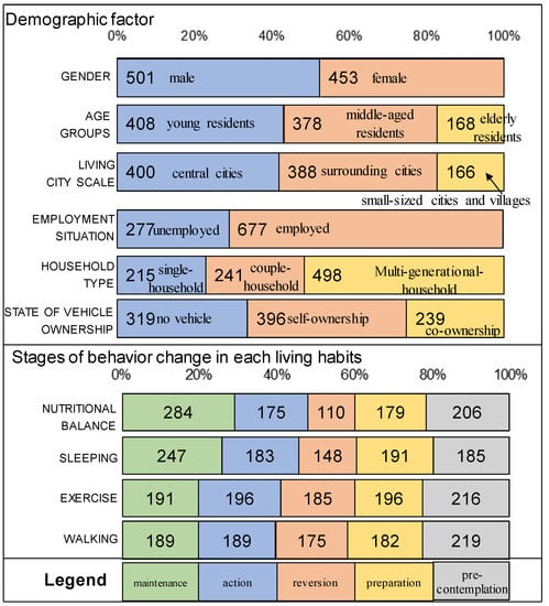 The collection status is shown in Figure 1. The sample size of each gender, age group, and city size is controlled when the target samples is taken. According to the recycling survey results, the sample size of males (=501) and females (=453) is almost the same. However, due to the substantial difference in the number of registered monitors in different age groups and city sizes, this study controlled the deviation of the number of samples recovered in each age group (younger residents = 408, middle-age residents = 378, elderly residents = 168) and inhabited city scale (central cities = 400, surrounding cities = 388, small-sized cities and villages = 166)to the maximum extent. The distribution of other non-control, demographic factors is mostly in the sample of employed (=677). and multi-generational-household (=498). In the case of the state of vehicle ownership, there is little difference in the sample of no vehicle (=319), self-ownership (=396), and co-ownership (=239). Samples of each stage of behavioral change living habits were also controlled, although maintenance stages of the nutrition balance and sleeping contained more samples than the other samples.