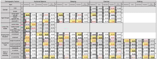 Result of cross-tabulation analysis of the distributional trends of stages of behavioral change of each living habits because of different demographic factors (independence test, p value < 0.05 *, p value < 0.01 **; only the results which have significant difference are shown. Red numbers: p value < 0.01 in residual analysis, Underlines: p value < 0.05 in residual analysis. Yellow frame: significantly less).
