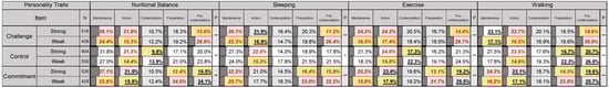 Result of cross-tabulation analysis of the distributional trends of stages of behavioral change of each living habit because of different personality traits (independence test, p value < 0.05 *, p value < 0.01 **; Red numbers: p value < 0.01 in residual analysis, Underlines: p value < 0.05 in residual analysis. Yellow frame: significantly less).