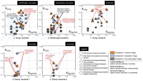 - Specifically examining the results of nutritional balance (Figure 4a,b), among those in the ‘preparation’ stage, the incidence of the social and community network between the young residents (10 group) and middle-aged residents (13 groups) who used the co-ownership vehicle shows the largest difference in the inhibitory risk factor (Figure 4a,b).