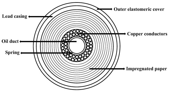 As shown in Figure 1, the cable exhibits a multilayer structure with the central, open duct where the oil freely flows. Around the duct, two layers of multiple copper conductors are kept in position by a metallic spring. The wires are surrounded by hundreds of layers of superimposed insulation paper, impregnated by oil. The outer layers of the cable are made of a lead casing covered by an elastomeric sheath. The diameter of the inner channel is 14 mm and the thickness of the paper layers is 17 mm.