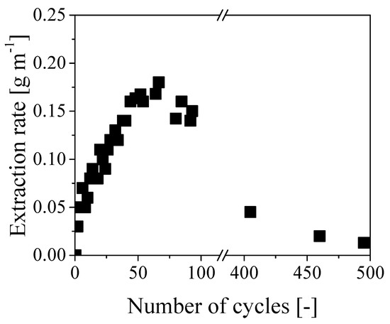 Figure 5 reports the oil extraction rate as a function of the number of operating cycles. Notably, the extraction rate increased almost linearly for about 60 cycles up to a maximum value of 0.18 g min−1. As each cycle lasted about 7 minutes, this resulted in a maximum extraction rate of approximately 1.3 g cycles−1. On the other hand, the same rate started decreasing afterward, reaching values of 0.05 and 0.02 g min−1 after 400 and 500 cycles, respectively. Since the applied average pressure was quite constant all along the experiment, the initial increase of removal rate is consistent with the classical Darcy law [13]: