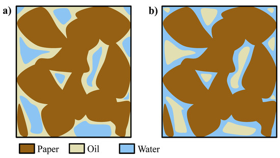 During the pressurization step, water penetrates into the paper region at the beginning of the phase (without wetting the paper) and remains entrained within the oil (which wets the paper), and water droplets or domains, surrounded by oil as continuous medium and not in contact with the paper, are formed (Figure 6a). However, at longer times (tf), water is slowly wetting the paper which has higher affinity with respect to it, thus displacing the oil and reversing the picture, finally forming oil droplets or domains inside an aqueous matrix in contact with the paper (Figure 6b) [15,16]. To verify this mechanism, a piece of paper impregnated by oil was soaked in water and left at rest; after some time, the oil was displaced and formed a layer at the top of the vessel, thus proving the displacing ability of the water with respect to the oil as well as the inversion of wetting fluid, from oil to water.